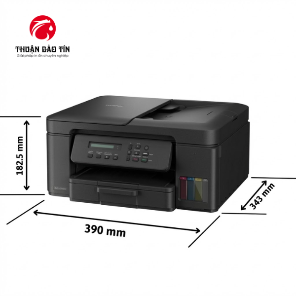 Máy in Brother DCP-T730DW có thiết kế nhỏ gọn với kích thước chỉ 390 mm x 343 mm x 183 mm, giúp dễ dàng lắp đặt trong không gian làm việc hạn chế. Việc sở hữu thiết kế này không chỉ giúp tiết kiệm diện tích mà còn mang lại sự tiện lợi cho các văn phòng nhỏ hoặc gia đình, nơi mà không gian làm việc thường không được rộng rãi.