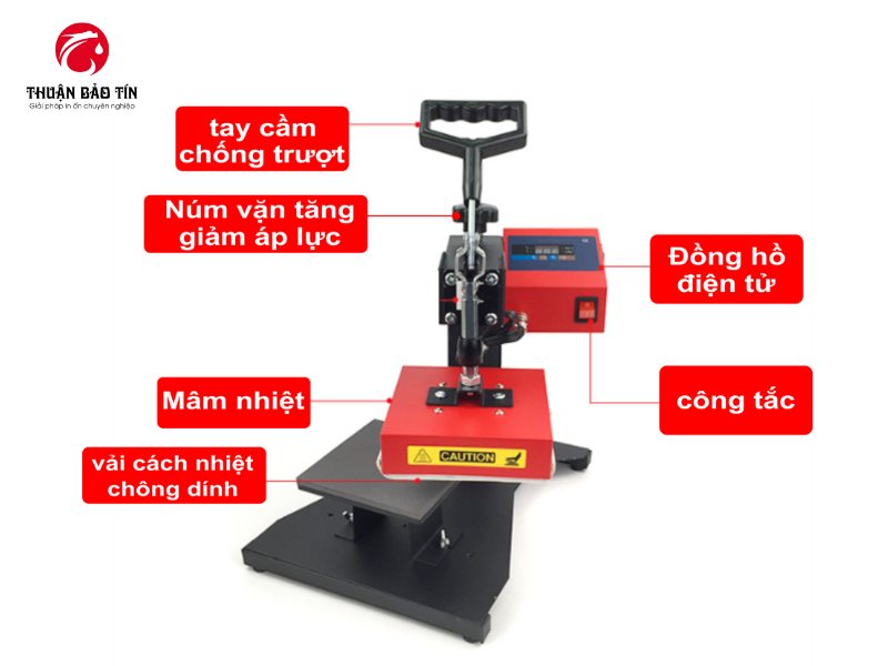 Bộ điều khiển điện tử gồm màn hình hiển thị nhiệt độ và thời gian, cho phép người dùng cài đặt từ vài giây đến vài phút tùy vật liệu. Khung máy làm từ thép chịu lực, kết hợp với tay đòn cơ học giúp đóng mở mâm ép nhẹ nhàng. Toàn bộ hệ thống tạo thành một thiết bị hoạt động ổn định, chuyên dùng để ép áo thun, vải và các vật liệu phẳng.