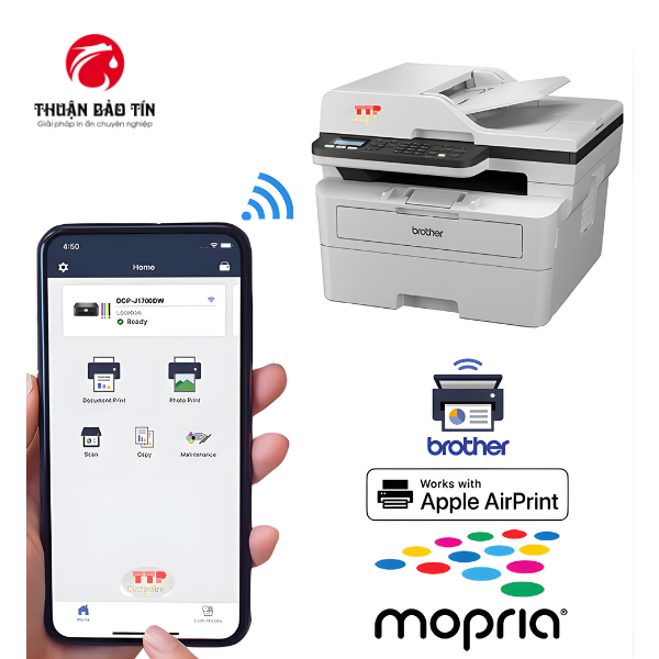 Máy in Brother DCP-B7640DW hỗ trợ kết nối WiFi, AirPrint và Mopria, mang đến trải nghiệm in ấn linh hoạt.