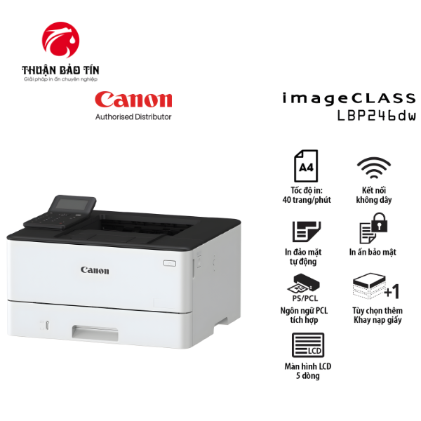 Trong môi trường làm việc hiện đại, việc lựa chọn một thiết bị in ấn ổn định, bền bỉ và dễ triển khai sẽ giúp công việc văn phòng trở nên trôi chảy hơn mỗi ngày. Đó cũng là lý do Canon LBP246DW đang được nhiều doanh nghiệp nhỏ, văn phòng vừa và người làm việc chuyên nghiệp ưu tiên lựa chọn. Cùng Thuận Bảo Tín tìm hiểu công năng, lợi ích của máy in Canon LBP246DW cho văn phòng hiện nay. Thiết kế gọn gàng, dễ bố trí của Canon LBP246DW Canon LBP246DW sở hữu thiết kế gọn gàng với kích thước khoảng 399 x 373 x 249 mm, trọng lượng khoảng 8,7 kg, giúp dễ dàng bố trí trong nhiều không gian làm việc khác nhau. Máy phù hợp đặt tại bàn làm việc cá nhân, phòng hành chính hoặc khu vực in chung mà không chiếm nhiều diện tích, đáp ứng tốt cả mô hình văn phòng truyền thống lẫn không gian làm việc linh hoạt. Bên cạnh thiết kế, Canon LBP246DW còn được đánh giá cao về độ bền và khả năng vận hành ổn định. Với chu kỳ in tối đa lên đến 80.000 trang/tháng, máy hoạt động trơn tru trong thời gian dài, ít xảy ra lỗi kỹ thuật, phù hợp sử dụng lâu dài cho doanh nghiệp có nhu cầu in ấn thường xuyên. Canon LBP246DW giúp tối ưu chi phí vận hành và thời gian xử lý tài liệu Một trong những lợi ích lớn nhất khi sử dụng Canon LBP246DW chính là khả năng tối ưu chi phí vận hành lâu dài. Máy sử dụng hộp mực Canon Cartridge 070 / 070H, trong đó bản dung lượng cao cho khả năng in lên đến 10.200 trang kết hợp tính năng in hai mặt tự động là điểm cộng lớn của Canon LBP246DW, giúp người dùng tiết kiệm đáng kể lượng giấy tiêu thụ, giúp giảm đáng kể chi phí trên mỗi bản in và hạn chế tần suất thay mực.  Bên cạnh đó, thời gian in trang đầu tiên chỉ khoảng 5 giây, giúp người dùng tiết kiệm thời gian chờ đợi, đặc biệt trong những giai đoạn cao điểm. Việc hoàn thành tài liệu đúng tiến độ góp phần nâng cao hiệu quả làm việc chung của cả văn phòng. Tốc độ in nhanh đưa ra chất lượng bản in sắc nét Canon LBP246DW sở hữu tốc độ in ấn ấn tượng lên đến 40 trang/phút (A4) và 42 trang/phút (Letter), đáp ứng tốt nhu cầu xử lý tài liệu liên tục. Nhờ khả năng in nhanh, người dùng có thể hoàn thành khối lượng công việc lớn trong thời gian ngắn mà không làm gián đoạn quy trình làm việc. Tốc độ cao đặc biệt phù hợp với môi trường văn phòng bận rộn, nơi nhiều người cần in tài liệu cùng lúc. Canon LBP246DW giúp giảm tình trạng chờ đợi, nâng cao trải nghiệm sử dụng và hiệu suất chung, nhất là khi triển khai in qua mạng nội bộ. Bên cạnh tốc độ, Canon LBP246DW còn mang lại chất lượng bản in rõ ràng, chữ nét và đều mực nhờ công nghệ in laser đơn sắc tiên tiến. Văn bản in ra có độ tương phản cao, dễ đọc, phù hợp in hợp đồng, hồ sơ pháp lý hay tài liệu quan trọng. Canon LBP246DW hỗ trợ nhiều hình thức kết nối hiện đại Canon LBP246DW hỗ trợ đa dạng kết nối gồm USB 2.0, LAN Ethernet và Wi-Fi, Khả năng in không dây qua AirPrint, Mopria và Canon PRINT Business giúp dễ dàng tích hợp vào hệ thống văn phòng. Người dùng có thể in trực tiếp từ máy tính, laptop hoặc thiết bị di động mà không cần cấu hình phức tạp. Máy tương thích tốt với nhiều hệ điều hành phổ biến như Windows, macOS, Linux và Chrome OS. Việc cài đặt Driver Canon LBP246DW đơn giản, nhanh chóng, giúp triển khai dễ dàng trong môi trường nhiều thiết bị. Nhờ khả năng tương thích cao và vận hành ổn định, Canon LBP246DW giúp bộ phận IT tiết kiệm thời gian, công sức khi đưa máy vào sử dụng và quản lý lâu dài. Thuận Bảo Tín chuyên cung cấp máy in Canon LBP246DW uy tín Đà Nẵng Thuận Bảo Tín là đơn vị chuyên cung cấp máy in Canon LBP246DW chính hãng uy tín tại Đà Nẵng, được nhiều doanh nghiệp và văn phòng tin tưởng lựa chọn. Khi mua Canon LBP246DW tại Thuận Bảo Tín, khách hàng được cam kết sản phẩm mới 100%, đầy đủ bảo hành theo tiêu chuẩn Canon, đồng thời được tư vấn giải pháp in ấn phù hợp, hỗ trợ cài đặt Driver Canon LBP246DW và cung cấp hộp mực máy in Canon LBP246DW chính hãng giúp tối ưu chi phí sử dụng lâu dài. Liên hệ ngay Thuận Bảo Tín để được tư vấn chi tiết, báo giá nhanh và nhận nhiều ưu đãi hấp dẫn.