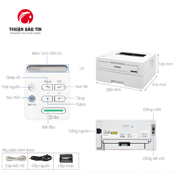 Máy in Brother HL-B2180DW sở hữu thiết kế vuông vức, đường nét thanh lịch cùng tông màu trắng trang nhã, phù hợp với môi trường làm việc chuyên nghiệp. Với kích thước 360 × 356 × 183 mm, máy dễ dàng đặt trên bàn làm việc, kệ tủ hoặc góc văn phòng mà không chiếm nhiều diện tích.